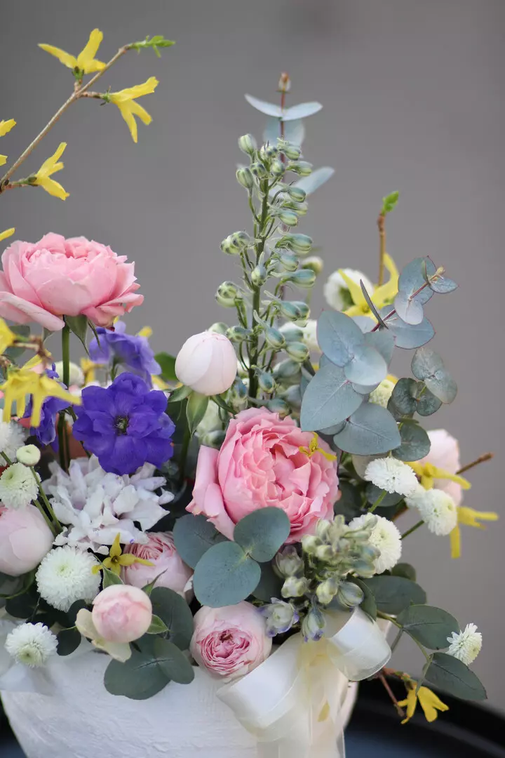 Дельфиниум Роза пионовидная Хризантема Эвкалипт Экзотика